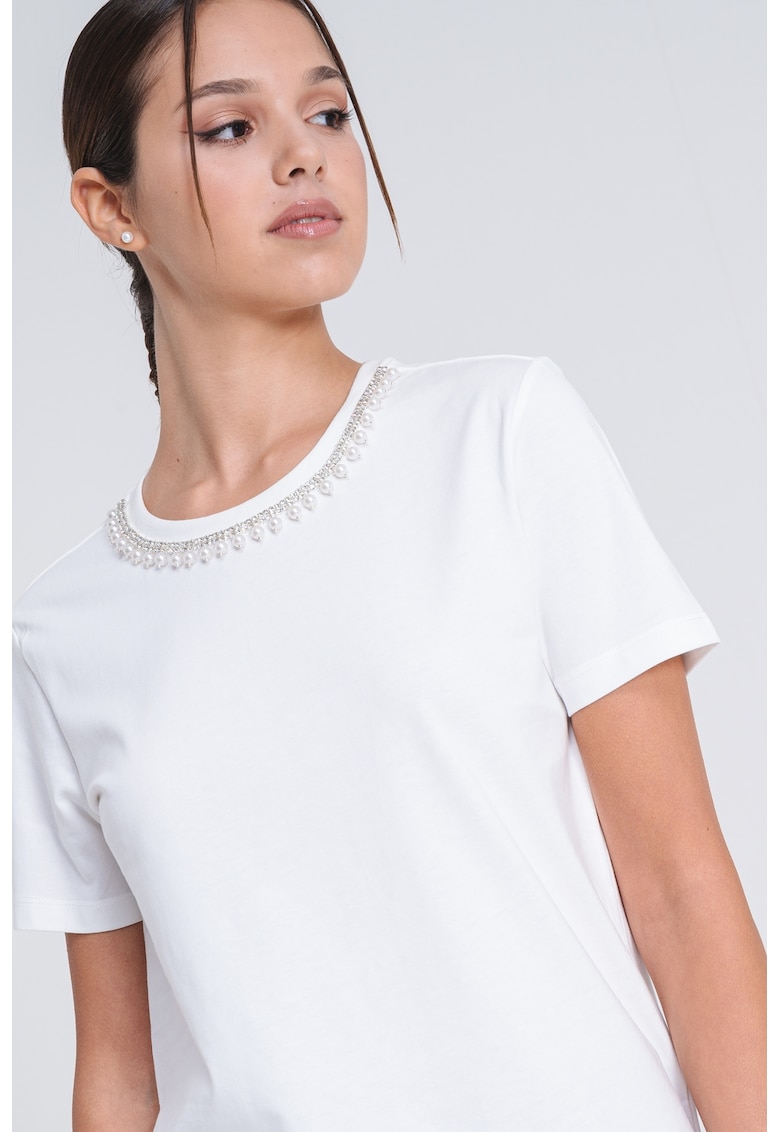 Caracteristici Culoare: alb Imprimeu: uni Material: bumbac organic Croiala: regular fit Model: rotund Lungime maneca: maneca scurta Detalii: decorat cu strasuri si margele Compozitie Exterior: 100% bumbac organic Info model Modelul poarta un produs de marimea S. Marimi model: 174 cm inaltime