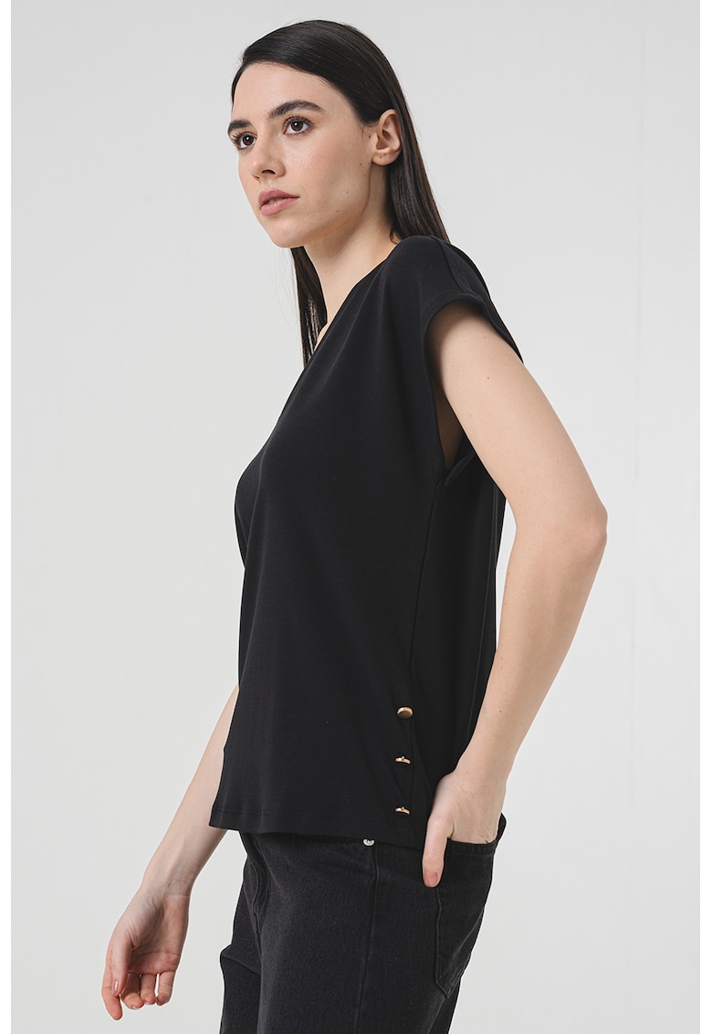 Caracteristici Culoare: negru Imprimeu: uni Material: bumbac organic Croiala: regular fit Model: in v Lungime maneca: maneca scurta Compozitie Exterior: 100% bumbac organic Info model Modelul poarta un produs de marimea S. Marimi model: 177 cm inaltime