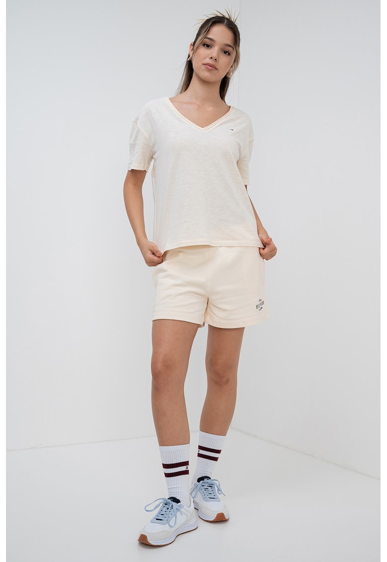 Caracteristici Culoare: galben pal Imprimeu: uni Material: bumbac organic Croiala: regular fit Model: in v Lungime maneca: maneca scurta Compozitie Exterior: 100% bumbac Info model Modelul poarta un produs de marimea S. Marimi model: 174 cm inaltime