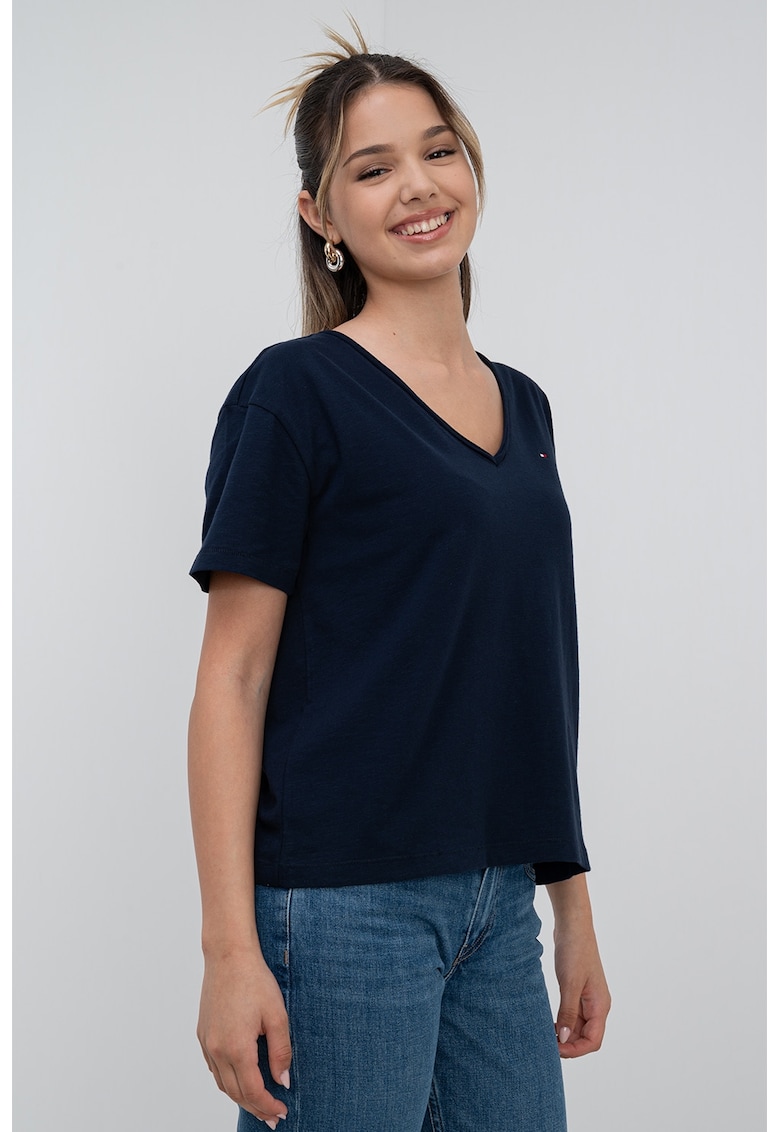 Caracteristici Culoare: bleumarin Imprimeu: uni Material: bumbac organic Croiala: regular fit Model: in v Lungime maneca: maneca scurta Compozitie Exterior: 100% bumbac Info model Modelul poarta un produs de marimea S. Marimi model: 174 cm inaltime