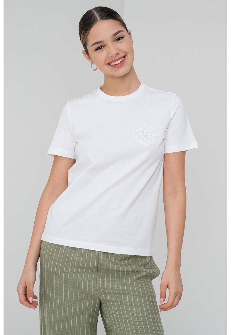 Caracteristici Culoare: alb optic Imprimeu: uni Material: bumbac organic Croiala: regular fit Model: decolteu la baza gatului Lungime maneca: maneca scurta Compozitie Exterior: 100% bumbac organic Info model Modelul poarta un produs de marimea S. Marimi model: 174 cm inaltime