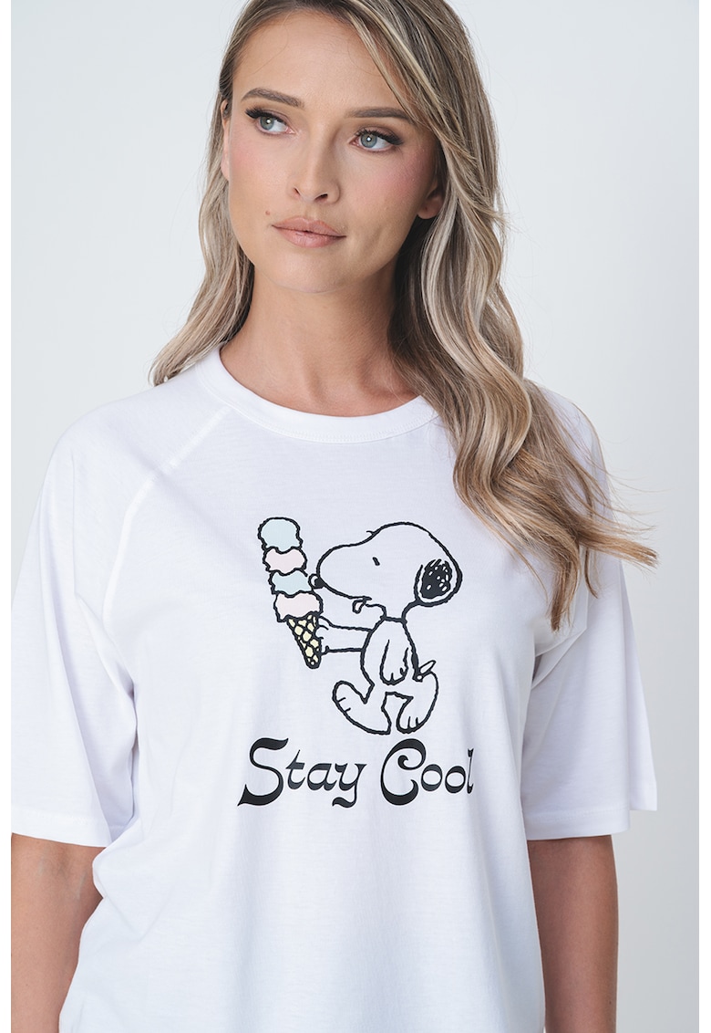 Caracteristici Culoare: alb Imprimeu: desene animate Material: bumbac organic Croiala: lejer Model: rotund Maneci: raglan Lungime maneca: maneca scurta Compozitie Exterior: 100% bumbac organic Info model Modelul poarta un produs de marimea S. Marimi model: 174 cm inaltime