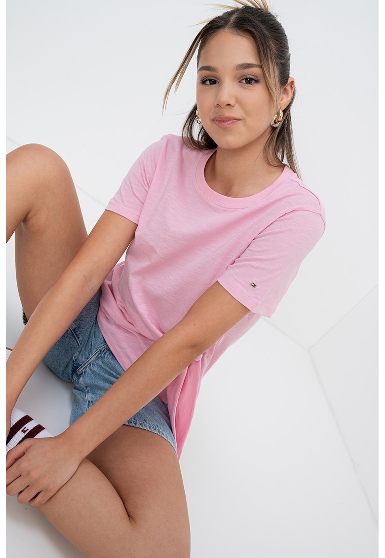 Caracteristici Culoare: roz deschis Imprimeu: uni Material: bumbac organic Croiala: regular fit Model: decolteu la baza gatului Lungime maneca: maneca scurta Compozitie Exterior: 100% bumbac organic Info model Modelul poarta un produs de marimea S. Marimi model: 174 cm inaltime