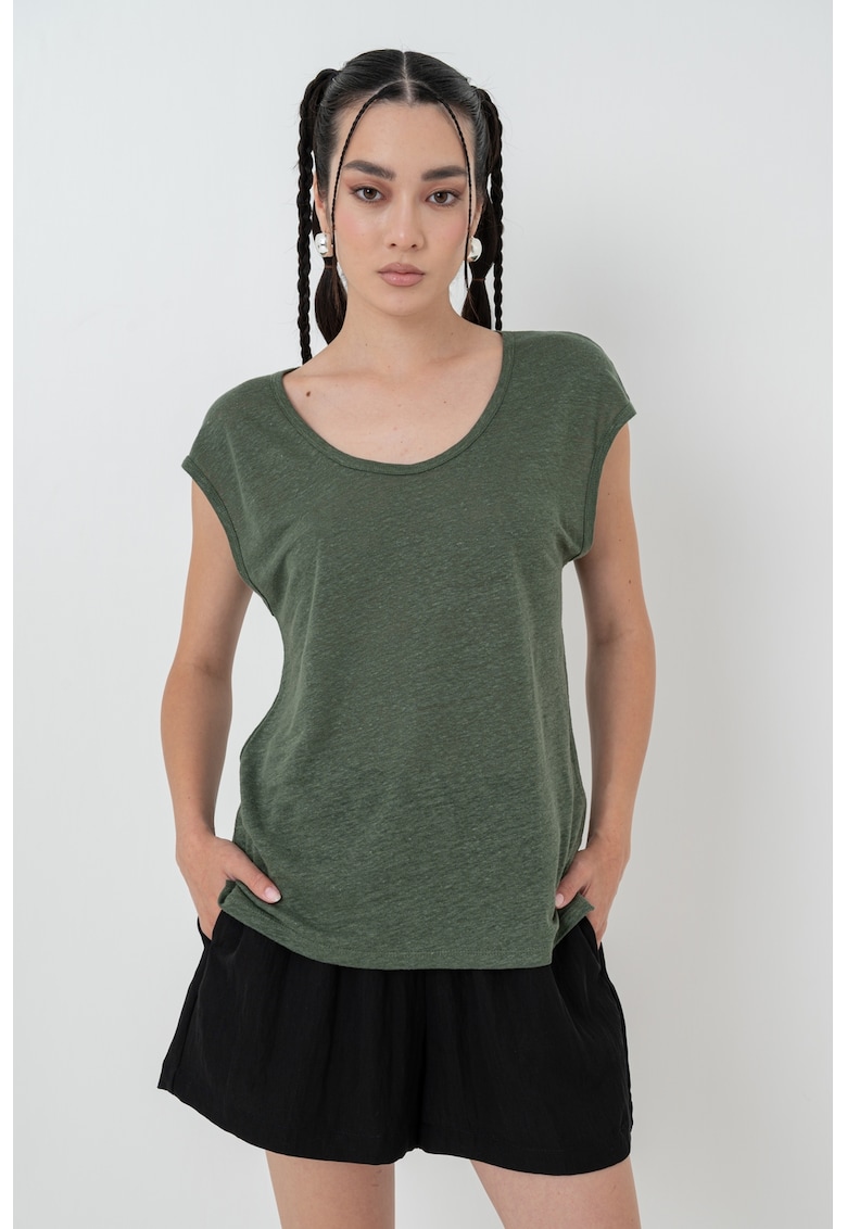 Caracteristici Culoare: verde Imprimeu: uni Material: in Croiala: regular fit Model: rotund Lungime maneca: maneca scurta Compozitie Exterior: 100% in Info model Modelul poarta un produs de marimea S. Marimi model: 170 cm inaltime