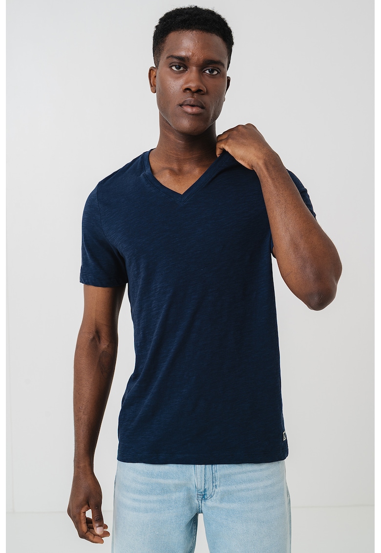 Caracteristici Culoare: bleumarin Imprimeu: uni Material: bumbac Croiala: regular fit Model: in v Lungime maneca: maneca scurta Compozitie Exterior: 100% bumbac Info model Modelul poarta un produs de marimea M. Marimi model: 184 cm inaltime