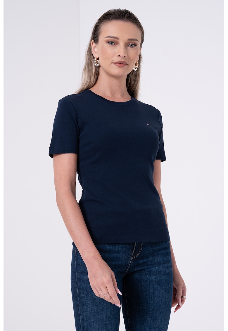 - bleumarin Imprimeu: uni Material: bumbac Croiala: slim fit Model: decolteu la baza gatului Lungime maneca: maneca scurta Compozitie Exterior: 100% bumbac Info model Modelul poarta un produs de marimea S. Marimi model: 174 cm inaltime