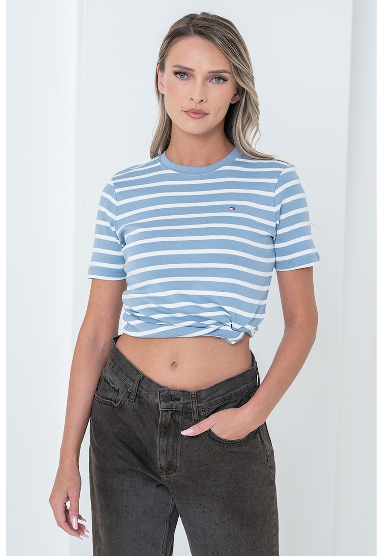 Caracteristici Culoare: albastru pastel Imprimeu: dungi Material: bumbac Croiala: regular fit Model: decolteu la baza gatului Lungime maneca: maneca scurta Compozitie Exterior: 100% bumbac Info model Modelul poarta un produs de marimea S. Marimi model: 174 cm inaltime