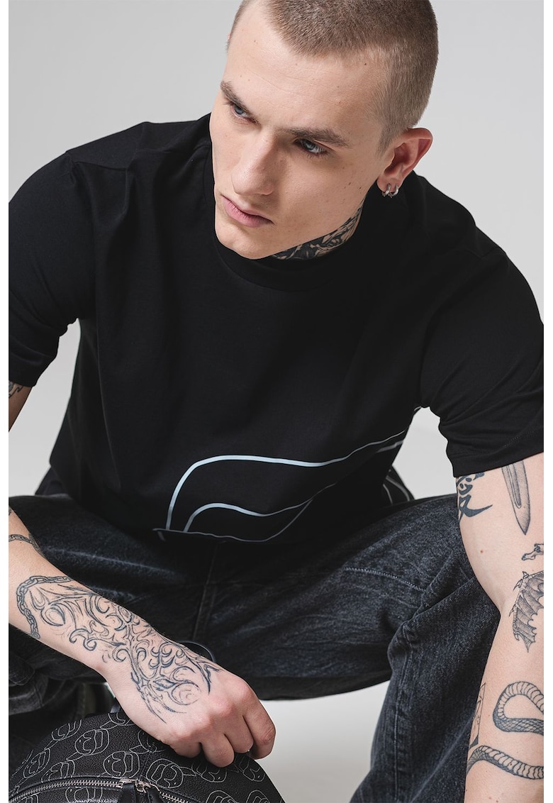 - albastru prafuit Imprimeu: logo Material: bumbac Croiala: regular fit Model: decolteu la baza gatului Lungime maneca: maneca scurta Compozitie Exterior: 100% bumbac Info model Modelul poarta un produs de marimea M. Marimi model: 188 cm inaltime