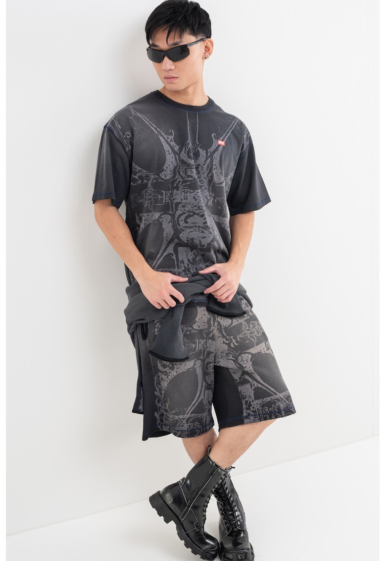- gri inchis Imprimeu: abstract Material: bumbac Croiala: supradimensionat Model: decolteu la baza gatului Lungime maneca: maneca scurta Compozitie Exterior: 100% bumbac Info model Modelul poarta un produs de marimea M. Marimi model: 183 cm inaltime