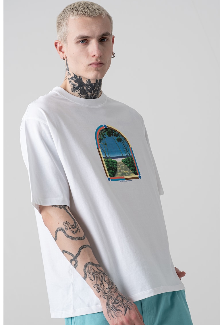 - albastru Imprimeu: grafic Material: bumbac Croiala: regular fit Model: decolteu la baza gatului Lungime maneca: maneca scurta Compozitie Exterior: 100% bumbac Info model Modelul poarta un produs de marimea M. Marimi model: 188 cm inaltime