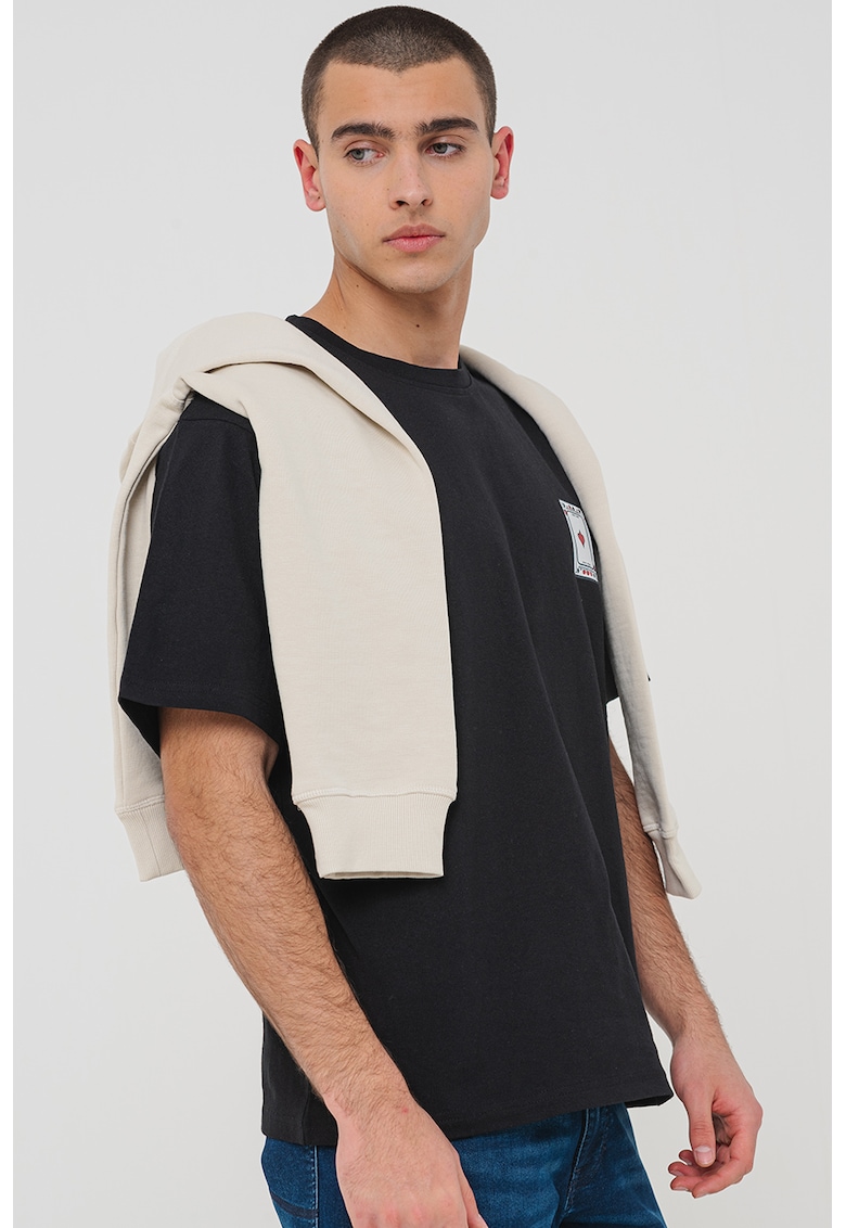 - negru Imprimeu: text Material: bumbac Croiala: lejer Model: decolteu la baza gatului Lungime maneca: maneca scurta Compozitie Exterior: 100% bumbac Info model Modelul poarta un produs de marimea M. Marimi model: 184 cm inaltime