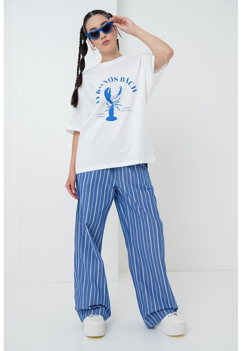 Caracteristici Culoare: albastru Imprimeu: text Material: bumbac Croiala: supradimensionat Model: decolteu la baza gatului Lungime maneca: maneca scurta Compozitie Exterior: 100% bumbac Info model Modelul poarta un produs de marimea S. Marimi model: 170 cm inaltime