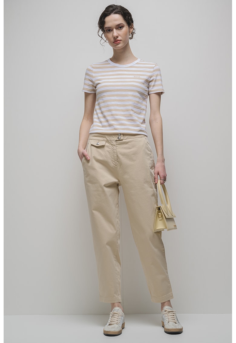 - bej Imprimeu: dungi Material: bumbac Croiala: regular fit Model: decolteu la baza gatului Lungime maneca: maneca scurta Compozitie Exterior: 100% bumbac Info model Modelul poarta un produs de marimea S. Marimi model: 177 cm inaltime