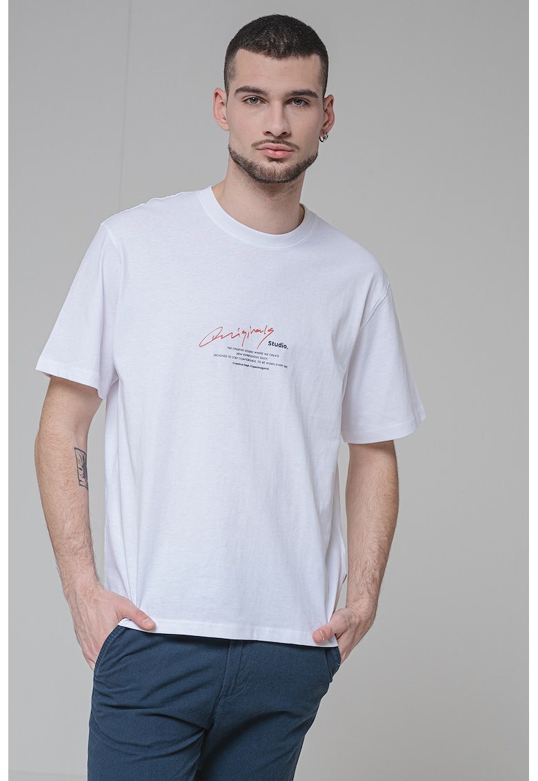 Caracteristici Culoare: alb optic Imprimeu: text Material: bumbac Croiala: regular fit Model: decolteu la baza gatului Lungime maneca: maneca scurta Compozitie Exterior: 100% bumbac Info model Modelul poarta un produs de marimea S. Marimi model: 190 cm inaltime