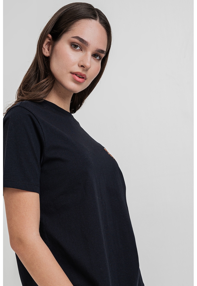 Caracteristici Culoare: negru Imprimeu: uni Material: bumbac organic Croiala: regular fit Model: decolteu la baza gatului Lungime maneca: maneca scurta Compozitie Exterior: 100% bumbac organic Info model Modelul poarta un produs de marimea S. Marimi model: 176 cm inaltime