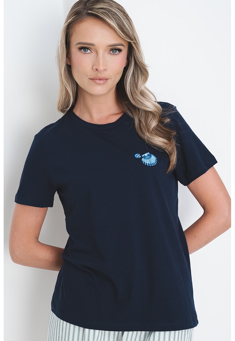 Caracteristici Culoare: bleumarin Imprimeu: grafic Material: bumbac organic Croiala: regular fit Model: decolteu la baza gatului Lungime maneca: maneca scurta Compozitie Exterior: 100% bumbac organic Info model Modelul poarta un produs de marimea S. Marimi model: 174 cm inaltime