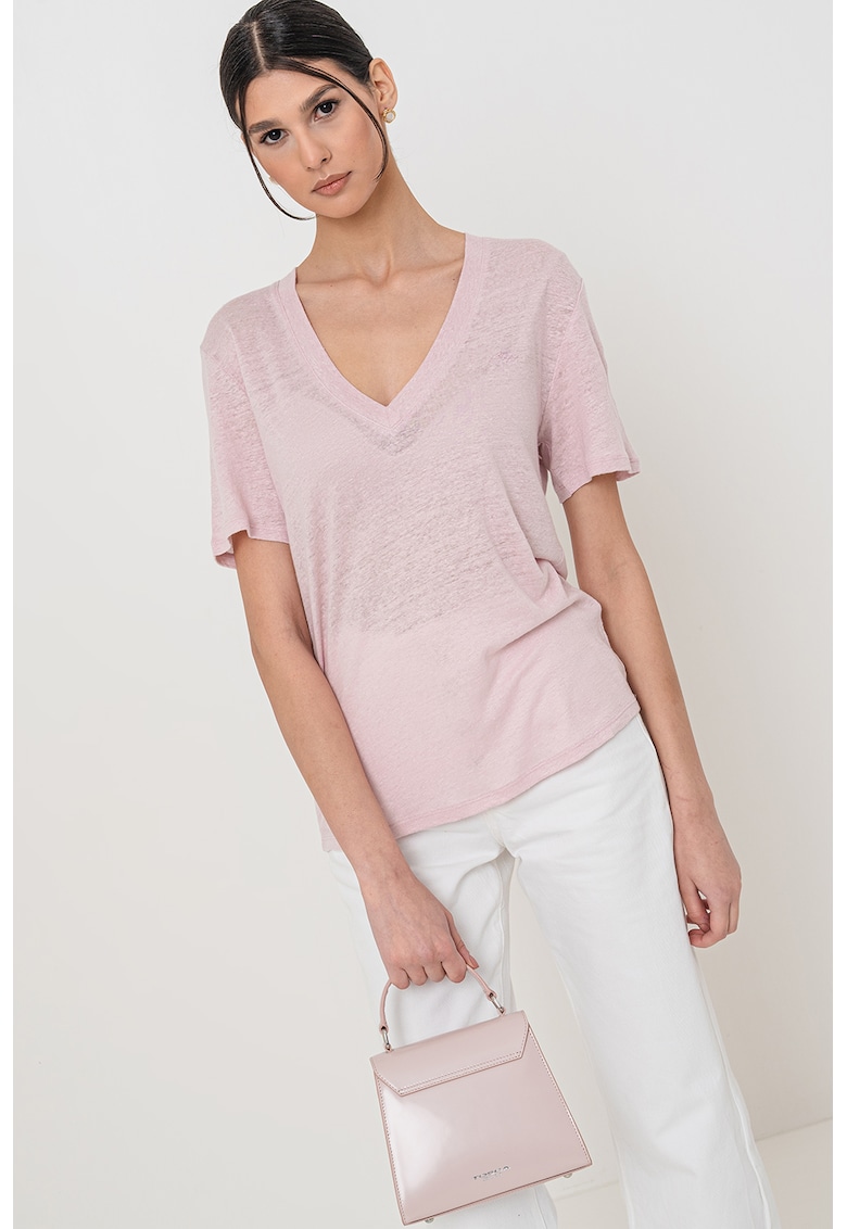 Caracteristici Culoare: roz pal Imprimeu: uni Material: in Croiala: lejer Model: in v Lungime maneca: maneca scurta Compozitie Exterior: 100% in Info model Modelul poarta un produs de marimea S. Marimi model: 181 cm inaltime