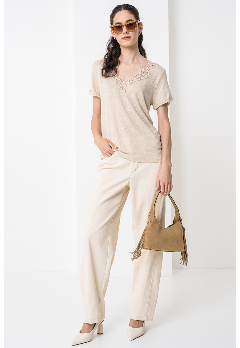 Caracteristici Culoare: maro nisip Imprimeu: uni Material: in Croiala: regular fit Model: in v Lungime maneca: maneca scurta Compozitie Exterior: 100% in Info model Modelul poarta un produs de marimea S. Marimi model: 175 cm inaltime
