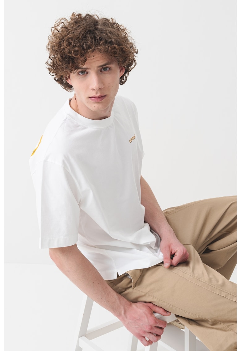 - alb optic Imprimeu: grafic Material: bumbac Croiala: regular fit Model: decolteu la baza gatului Lungime maneca: maneca scurta Compozitie Exterior: 100% bumbac Info model Modelul poarta un produs de marimea M. Marimi model: 190 cm inaltime