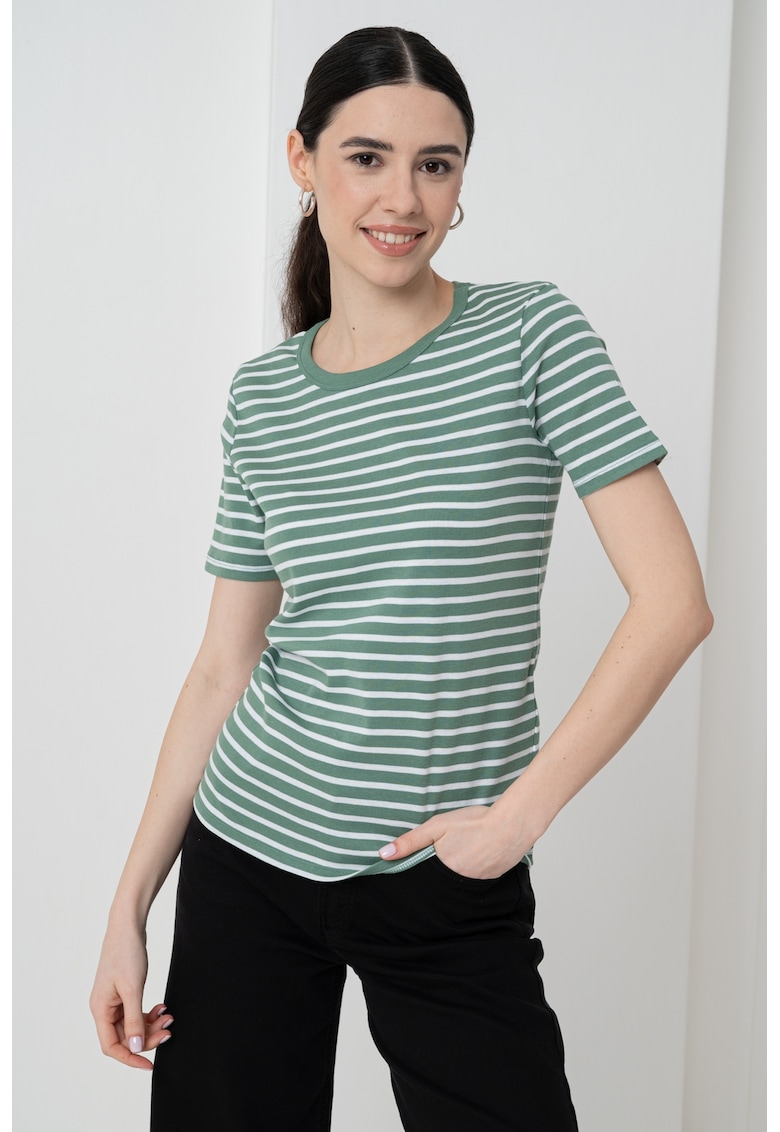 - verde Imprimeu: dungi Material: bumbac Croiala: regular fit Model: rotund Lungime maneca: maneca scurta Compozitie Exterior: 100% bumbac Info model Modelul poarta un produs de marimea S. Marimi model: 177 cm inaltime