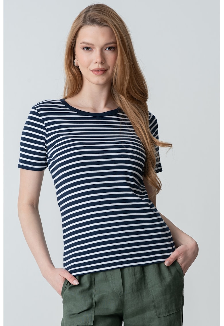 - bleumarin Imprimeu: dungi Material: bumbac Croiala: regular fit Model: rotund Lungime maneca: maneca scurta Compozitie Exterior: 100% bumbac Info model Modelul poarta un produs de marimea S. Marimi model: 176 cm inaltime