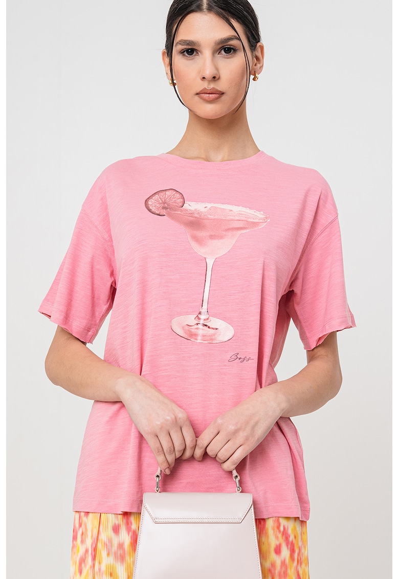 Caracteristici Culoare: roz Imprimeu: grafic Material: bumbac Croiala: lejer Model: decolteu la baza gatului Lungime maneca: maneca scurta Compozitie Exterior: 100% bumbac Info model Modelul poarta un produs de marimea S. Marimi model: 181 cm inaltime