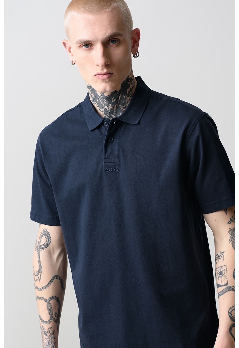 Caracteristici Culoare: bleumarin Imprimeu: uni Material: bumbac Croiala: regular fit Model: polo Lungime maneca: maneca scurta Compozitie Exterior: 100% bumbac Info model Modelul poarta un produs de marimea M. Marimi model: 188 cm inaltime