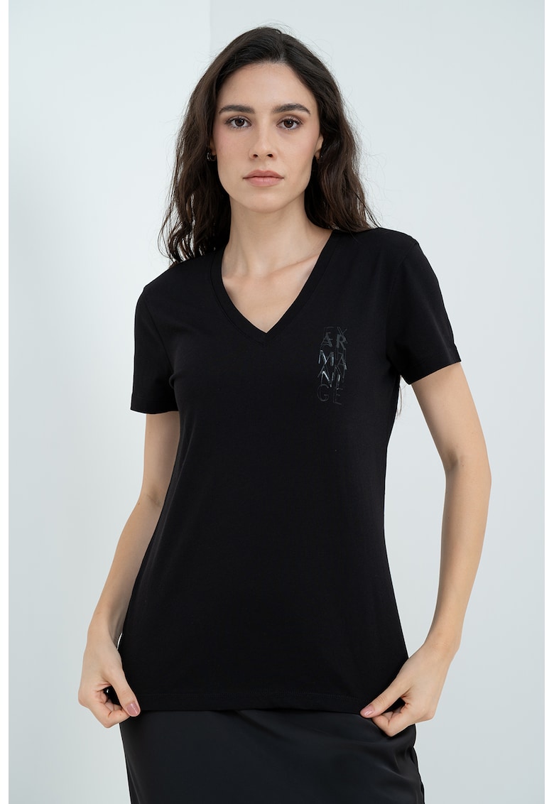 Caracteristici Culoare: negru Imprimeu: uni Material: bumbac Croiala: regular fit Model: in v Lungime maneca: maneca scurta Detalii: logo discret Compozitie Exterior: 100% bumbac Info model Modelul poarta un produs de marimea S. Marimi model: 177 cm inaltime