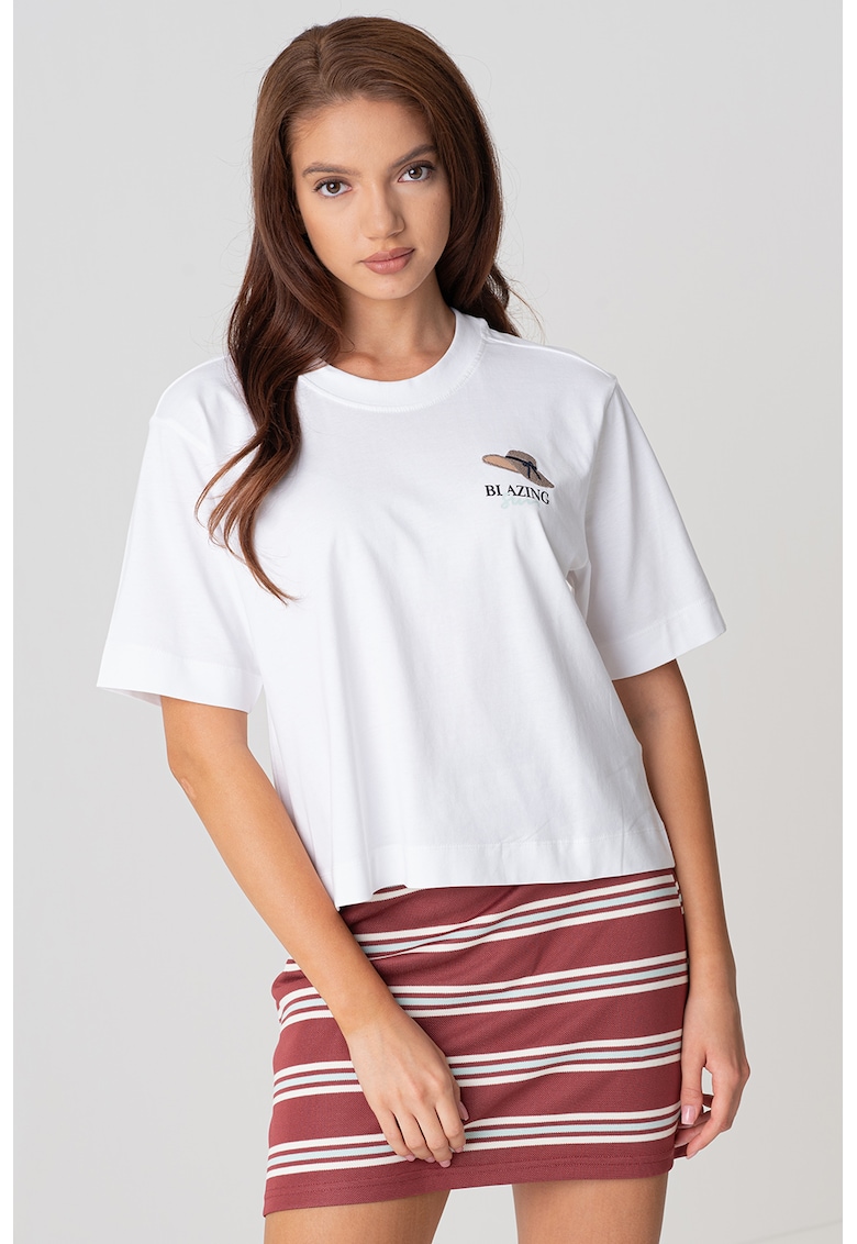Caracteristici Culoare: alb Imprimeu: grafic Material: bumbac Croiala: regular fit Model: decolteu la baza gatului Lungime maneca: maneca scurta Compozitie Exterior: 100% bumbac organic Info model Modelul poarta un produs de marimea S. Marimi model: 174 cm inaltime