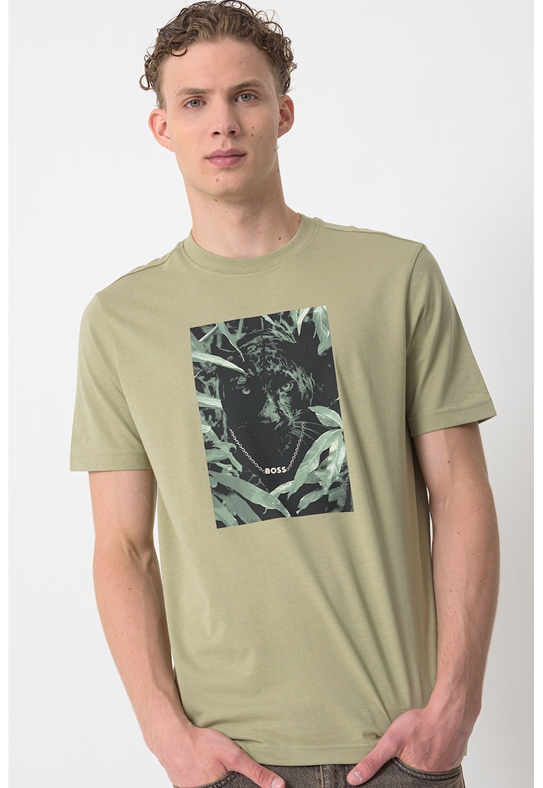 - verde pal Imprimeu: grafic Material: bumbac Croiala: regular fit Model: decolteu la baza gatului Lungime maneca: maneca scurta Compozitie Exterior: 100% bumbac Info model Modelul poarta un produs de marimea M. Marimi model: 170 cm inaltime