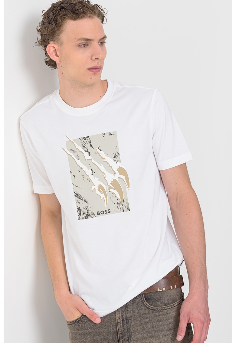 - grej Imprimeu: grafic Material: bumbac Croiala: regular fit Model: decolteu la baza gatului Lungime maneca: maneca scurta Compozitie Exterior: 100% bumbac Info model Modelul poarta un produs de marimea M. Marimi model: 170 cm inaltime