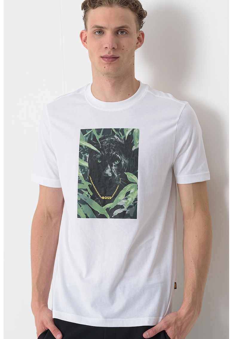 - alb optic Imprimeu: grafic Material: bumbac Croiala: regular fit Model: decolteu la baza gatului Lungime maneca: maneca scurta Compozitie Exterior: 100% bumbac Info model Modelul poarta un produs de marimea M. Marimi model: 170 cm inaltime
