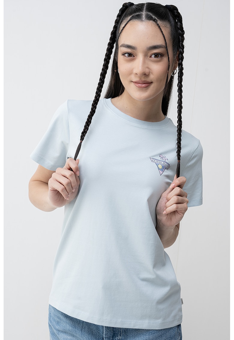 Caracteristici Culoare: albastru deschis Imprimeu: uni Material: bumbac Croiala: regular fit Model: decolteu la baza gatului Lungime maneca: maneca scurta Compozitie Exterior: 95% bumbac