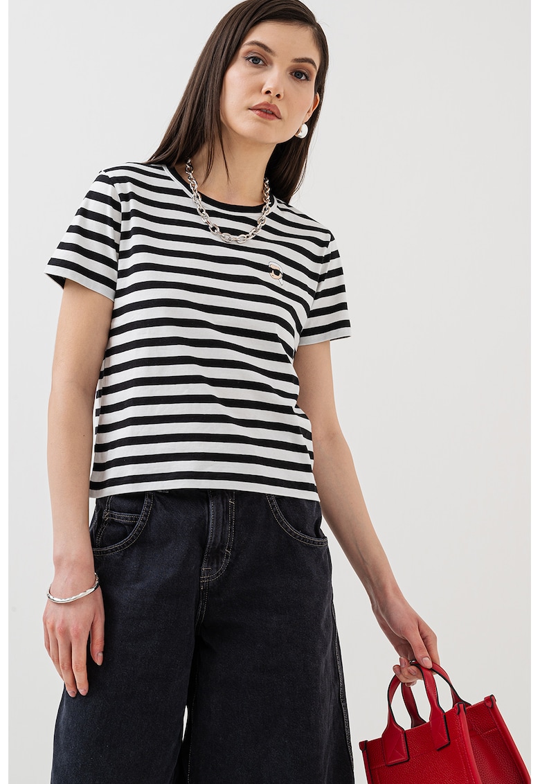 - negru Imprimeu: dungi Material: bumbac organic Croiala: lejer Model: decolteu la baza gatului Lungime maneca: maneca scurta Compozitie Exterior: 100% bumbac organic Info model Modelul poarta un produs de marimea S. Marimi model: 176 cm inaltime