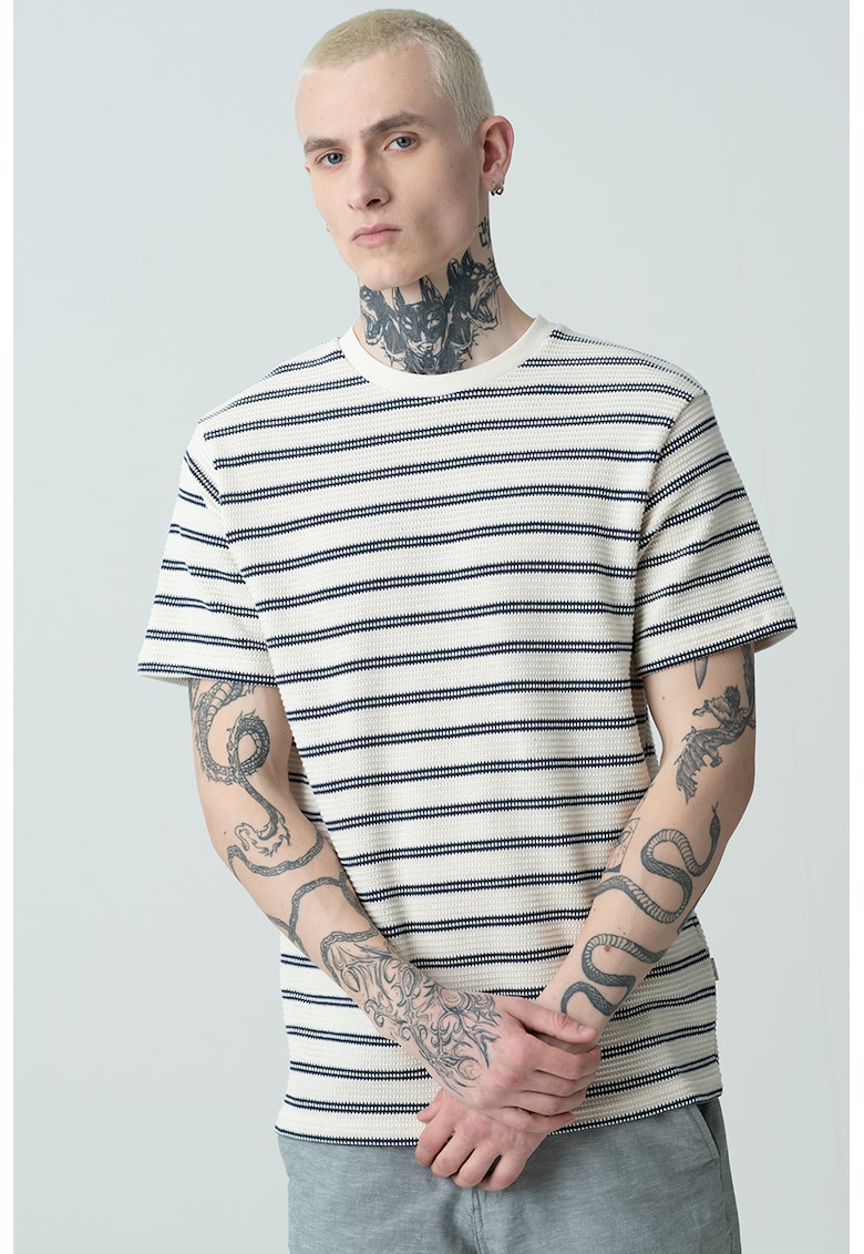 - bleumarin Imprimeu: dungi Material: bumbac Croiala: regular fit Model: decolteu la baza gatului Lungime maneca: maneca scurta Compozitie Exterior: 100% bumbac Info model Modelul poarta un produs de marimea M. Marimi model: 188 cm inaltime