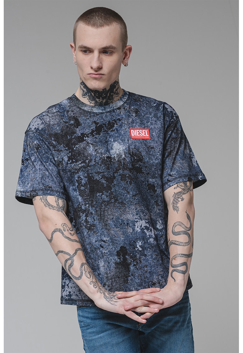 - albastru prafuit Imprimeu: tie-dye Material: bumbac Croiala: lejer Model: decolteu la baza gatului Lungime maneca: maneca scurta Compozitie Exterior: 100% bumbac Info model Modelul poarta un produs de marimea M. Marimi model: 188 cm inaltime