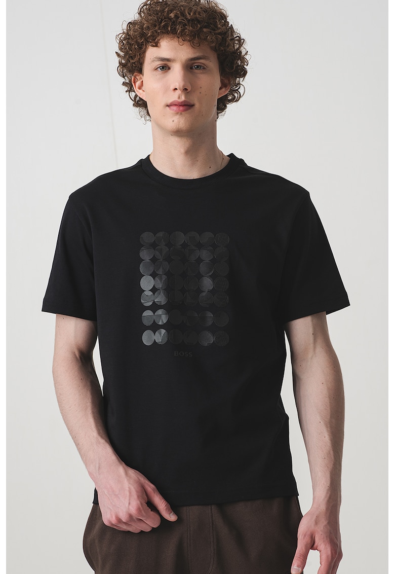 - grafic Material: bumbac Croiala: lejer Model: rotund Lungime maneca: maneca scurta Compozitie Exterior: 100% bumbac Info model Modelul poarta un produs de marimea M. Marimi model: 190 cm inaltime