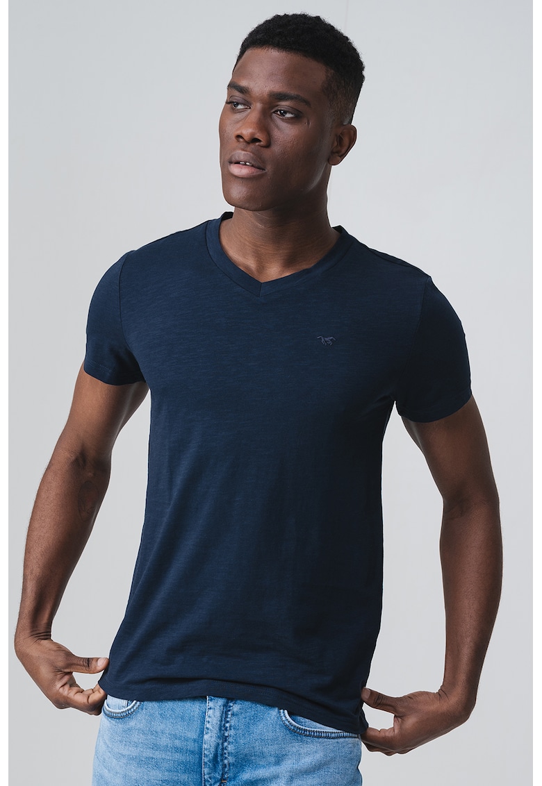 Caracteristici Culoare: bleumarin Imprimeu: uni Material: bumbac Croiala: slim fit Model: in v Lungime maneca: maneca scurta Compozitie Exterior: 100% bumbac Info model Modelul poarta un produs de marimea M. Marimi model: 184 cm inaltime