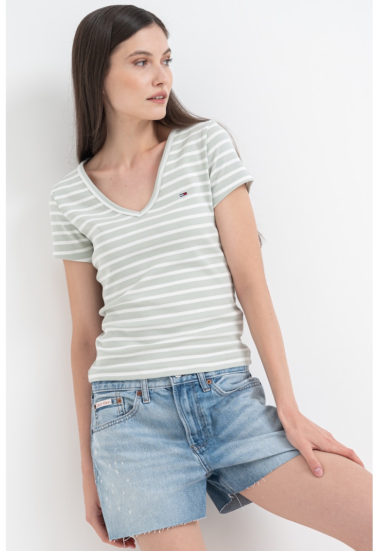 - verde prafuit Imprimeu: dungi Material: bumbac Croiala: slim fit Model: in v Lungime maneca: maneca scurta Compozitie Exterior: 95% bumbac