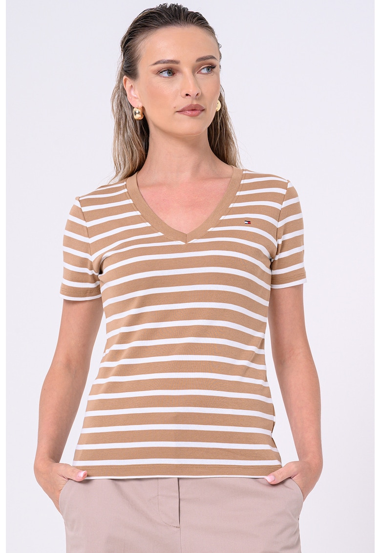 - maro deschis Imprimeu: dungi Material: bumbac Croiala: slim fit Model: in v Lungime maneca: maneca scurta Compozitie Exterior: 100% bumbac Info model Modelul poarta un produs de marimea S. Marimi model: 174 cm inaltime