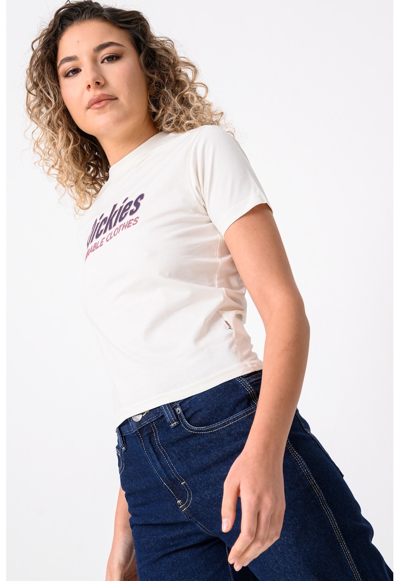 - alb murdar Imprimeu: logo Material: bumbac Croiala: slim fit Model: decolteu la baza gatului Lungime maneca: maneca scurta Compozitie Exterior: 100% bumbac Info model Modelul poarta un produs de marimea S. Marimi model: 178 cm inaltime