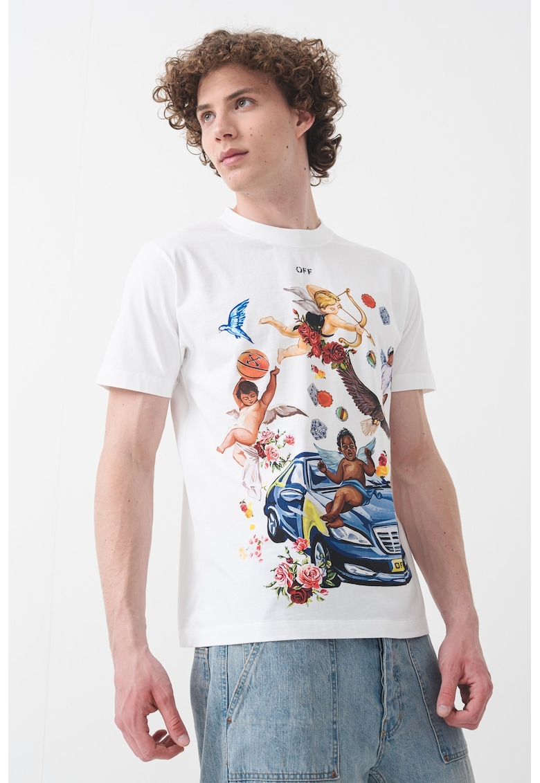 - alb optic Imprimeu: grafic Material: bumbac Croiala: slim fit Model: decolteu la baza gatului Lungime maneca: maneca scurta Compozitie Exterior: 100% bumbac Info model Modelul poarta un produs de marimea M. Marimi model: 190 cm inaltime