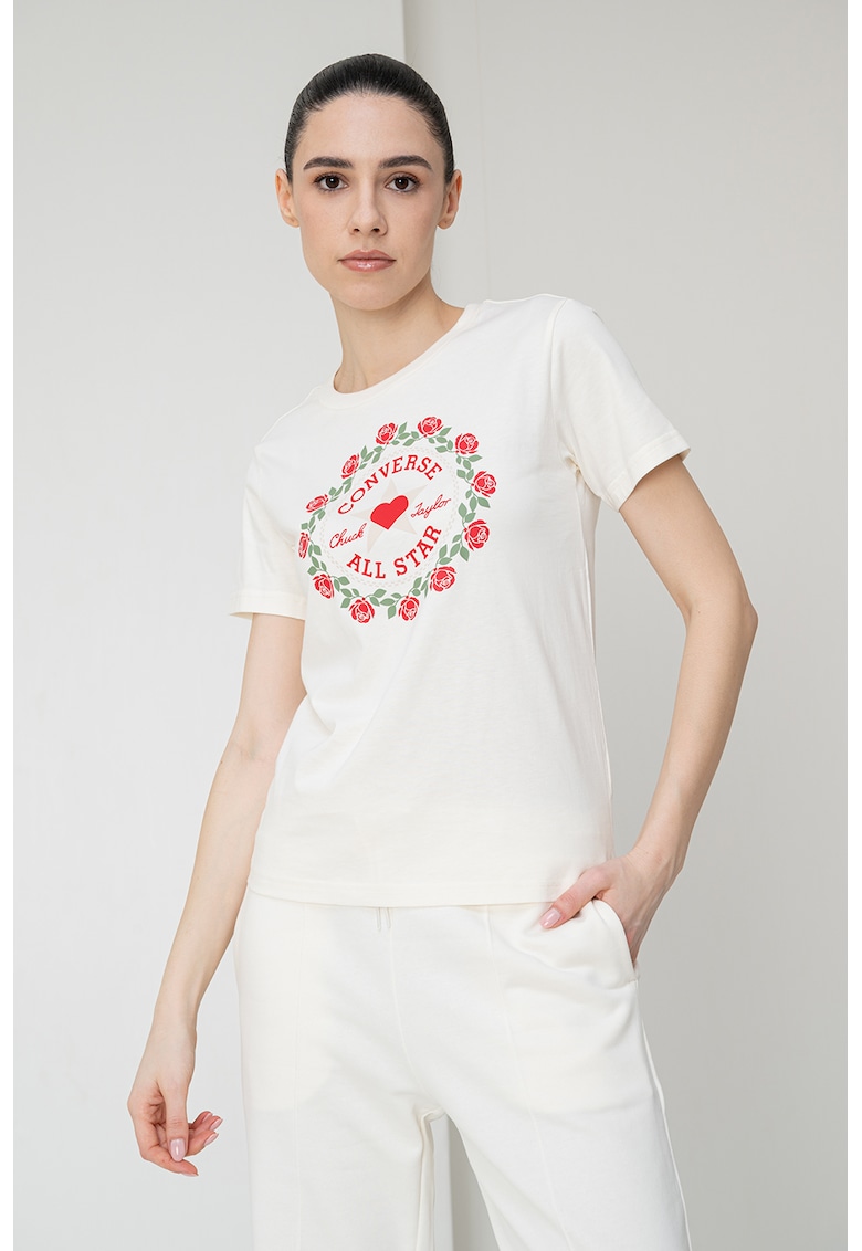 - crem Imprimeu: logo Material: bumbac Croiala: slim fit Model: decolteu la baza gatului Lungime maneca: maneca scurta Compozitie Exterior: 100% bumbac Info model Modelul poarta un produs de marimea S. Marimi model: 177 cm inaltime