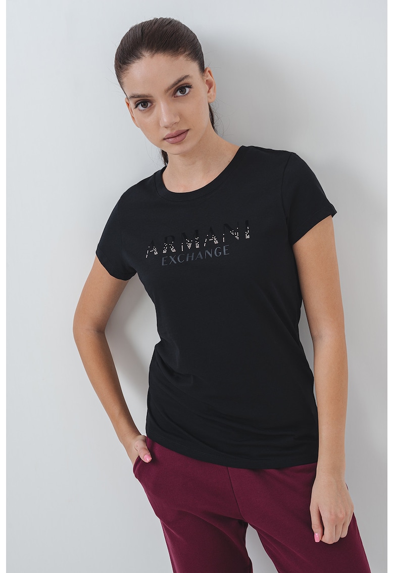 - transparent Imprimeu: logo Material: bumbac Croiala: slim fit Model: rotund Lungime maneca: maneca scurta Detalii: aplicatie cu strasuri Compozitie Exterior: 100% bumbac Info model Modelul poarta un produs de marimea S. Marimi model: 175 cm inaltime