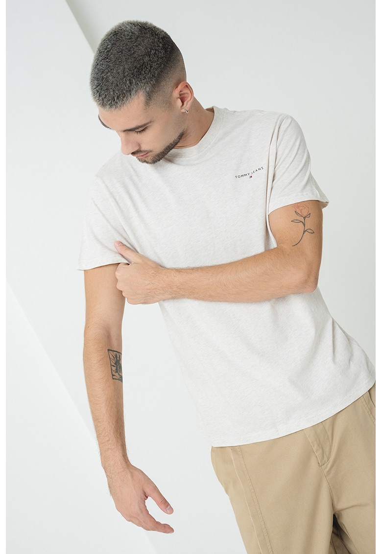 Caracteristici Culoare: gri deschis melange Imprimeu: uni Material: bumbac Croiala: regular fit Model: decolteu la baza gatului Lungime maneca: maneca scurta Compozitie Exterior: 100% bumbac Info model Modelul poarta un produs de marimea M. Marimi model: 190 cm inaltime