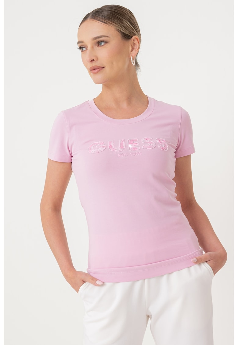 Caracteristici Culoare: roz pastel Imprimeu: logo Material: bumbac Croiala: regular fit Model: rotund Lungime maneca: maneca scurta Detalii: aplicatii cu paiete Compozitie Exterior: 95% bumbac