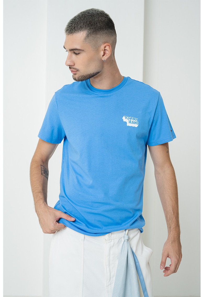 - albastru pastel Imprimeu: logo Material: bumbac Croiala: slim fit Model: decolteu la baza gatului Lungime maneca: maneca scurta Compozitie Exterior: 100% bumbac Info model Modelul poarta un produs de marimea M. Marimi model: 190 cm inaltime