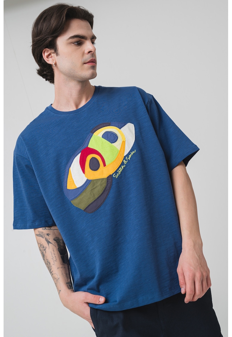 - albastru inchis Imprimeu: grafic Material: bumbac Croiala: supradimensionat Model: decolteu la baza gatului Lungime maneca: maneca scurta Detalii: broderie Compozitie Exterior: 100% bumbac Info model Modelul poarta un produs de marimea M. Marimi model: 180 cm inaltime