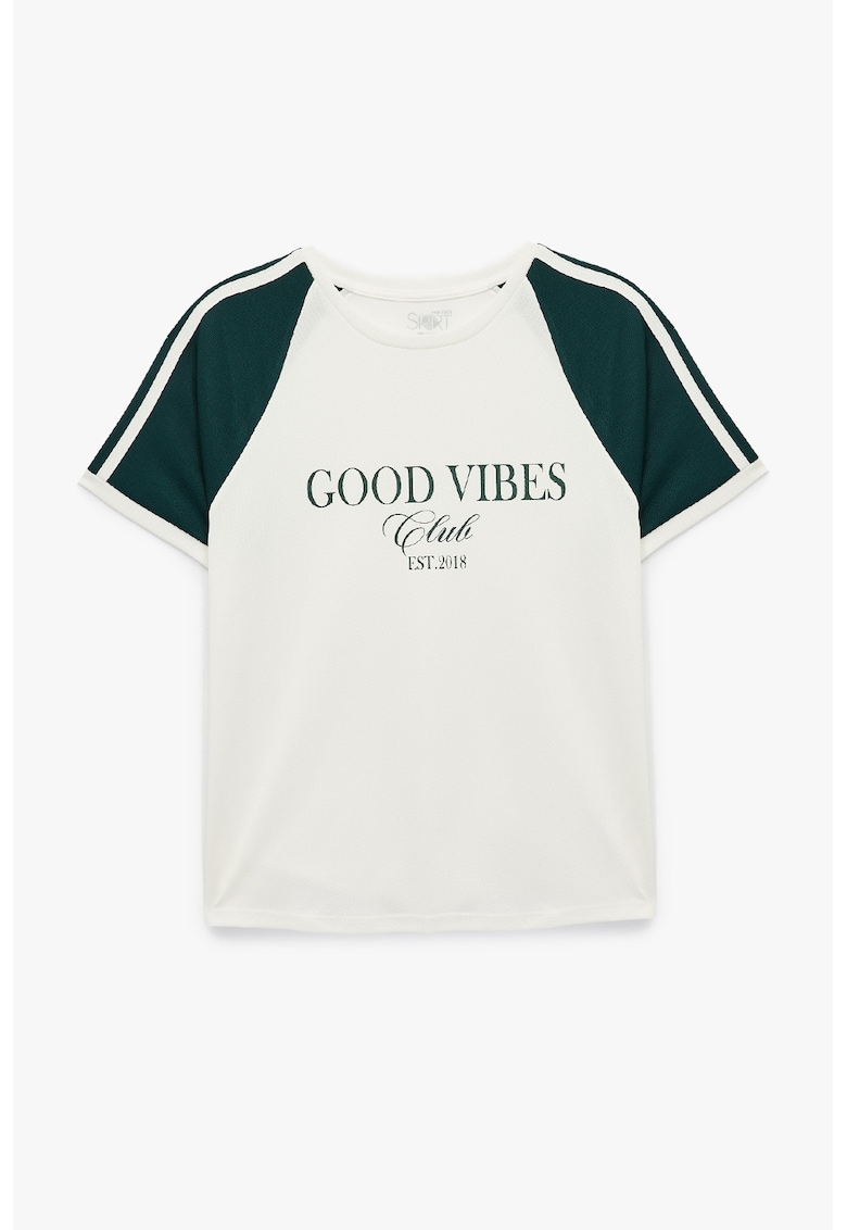 - verde englez Imprimeu: text Material: sintetic Croiala: supradimensionat Model: decolteu la baza gatului Maneci: raglan Lungime maneca: maneca scurta Detalii: adecvate pentru sport Compozitie Exterior: 100% poliester
