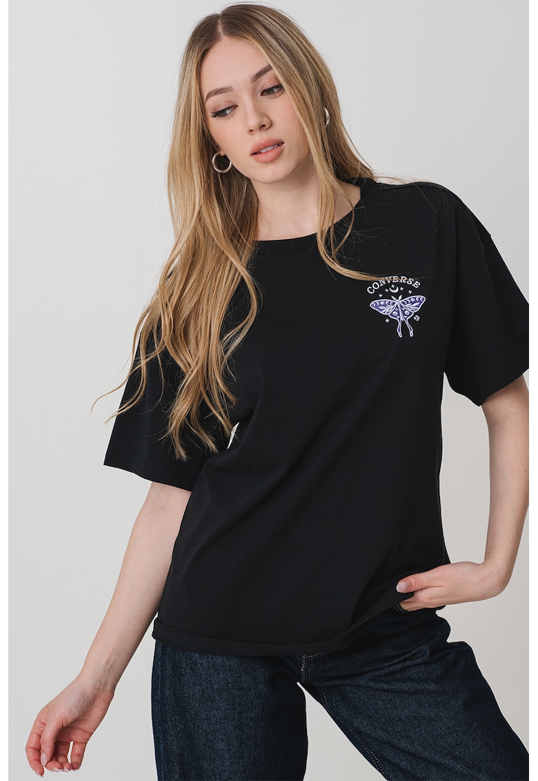 Caracteristici Culoare: negru Imprimeu: uni Material: bumbac Croiala: supradimensionat Model: decolteu la baza gatului Lungime maneca: maneca scurta Compozitie Exterior: 100% bumbac Info model Modelul poarta un produs de marimea S. Marimi model: 175 cm inaltime